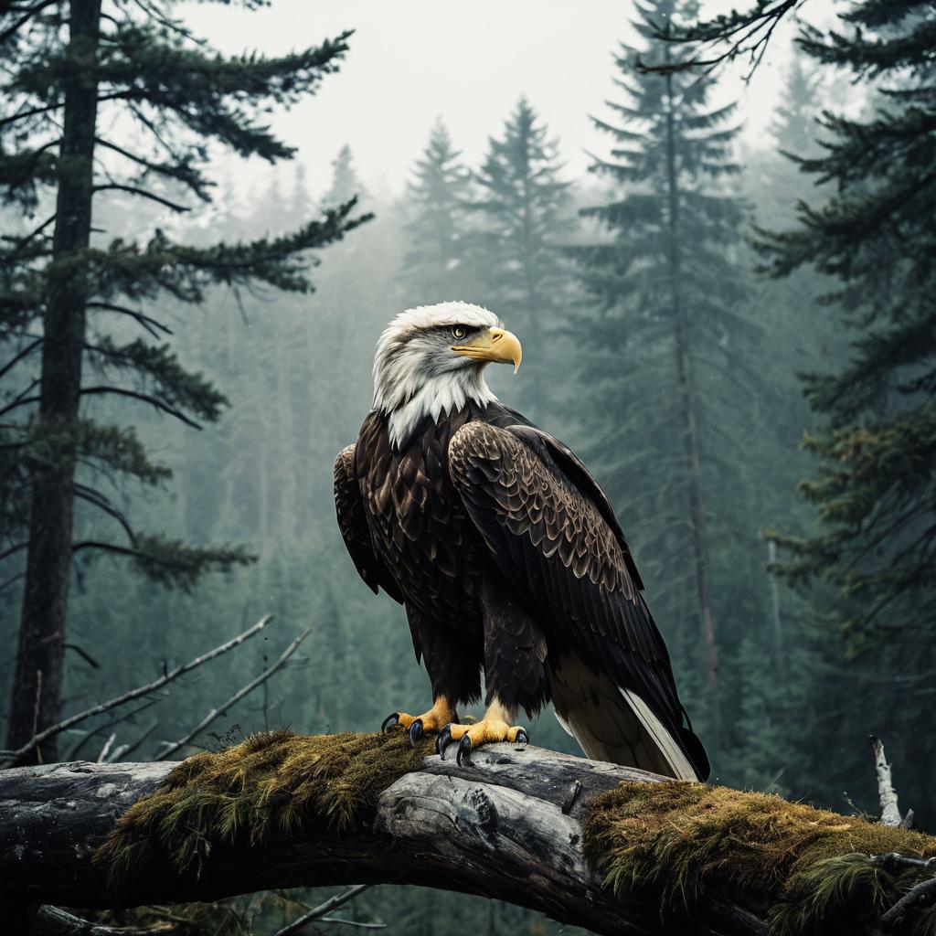 A high-quality illustration of a majestic eagle at rest, its sleek feathers and watchful eyes set against a misty forest clearing. The image conveys an aura of power, serenity, and noble grandeur.