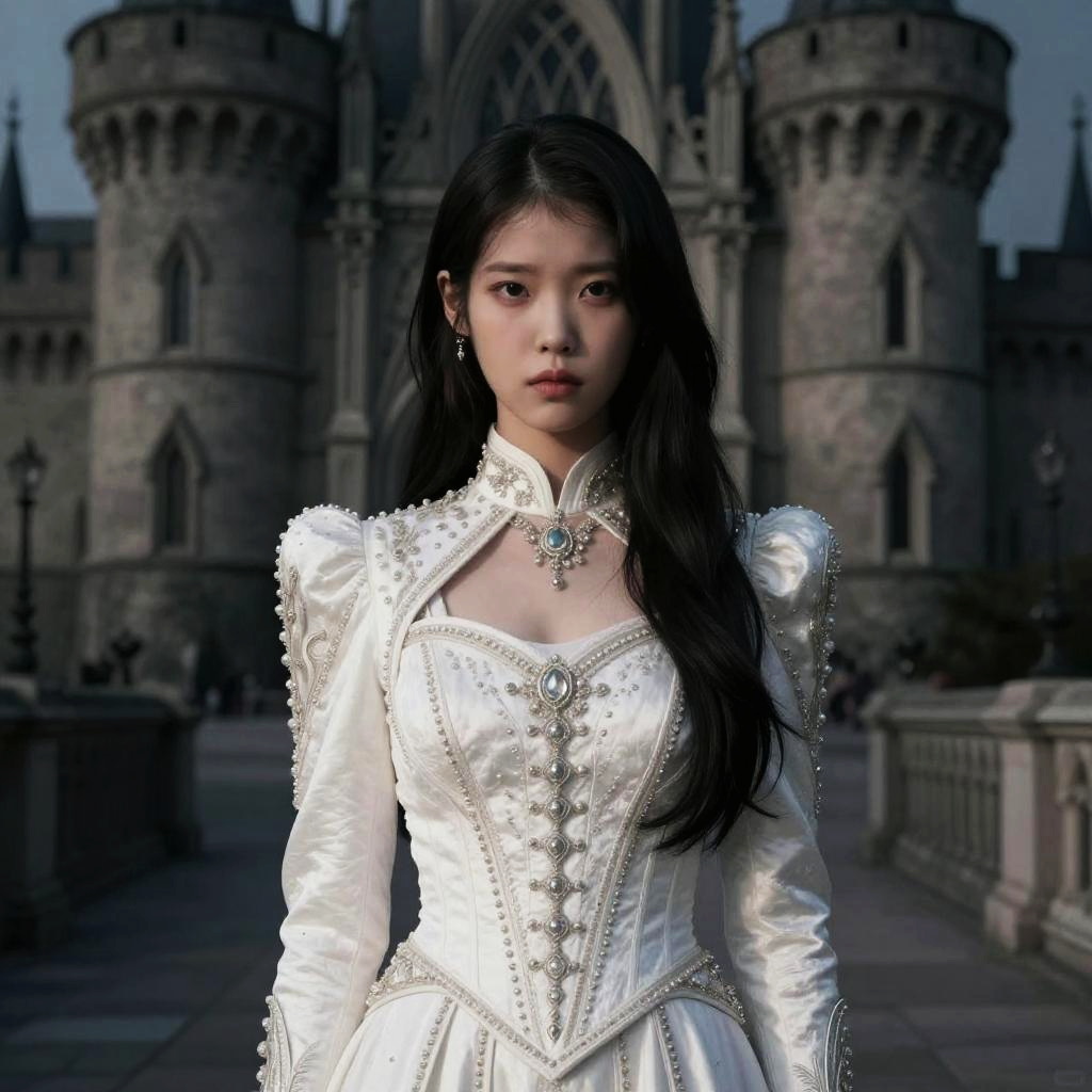 1girl, standing, gothic castle background, high res, 8k, 4k, absurdres, wearing ornate outfit, white outfit, IU, realistic proportions, stern emotion, inside castle, dark lighting, low saturation, perfect face