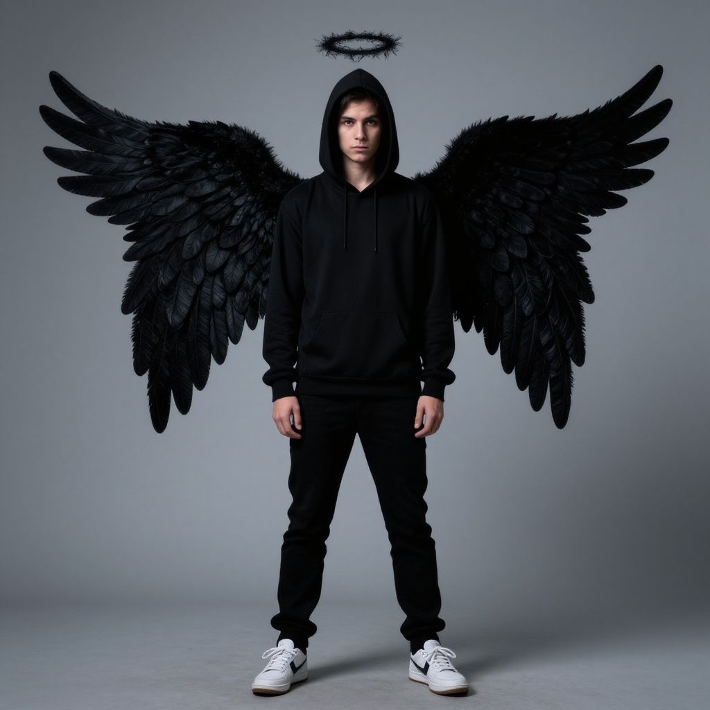 Spooky angel costume, halo, wings, 1boy, solo, hood, male focus, angel, hoodie, angel wings, shoes, sneakers, pants, standing, full body, looking at viewer, hood up