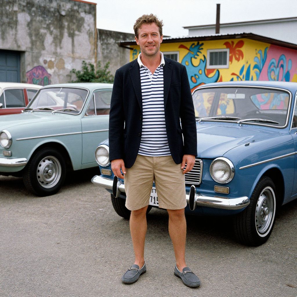 A man, black casual blazer, striped polo shirt, khaki shorts, gray slip-on loafers, outdoor lot with vintage cars, weathered facades, vibrant murals, ektachrome film stock, relaxed smile, casual confidence. Man has masculine face and piercing eyes
