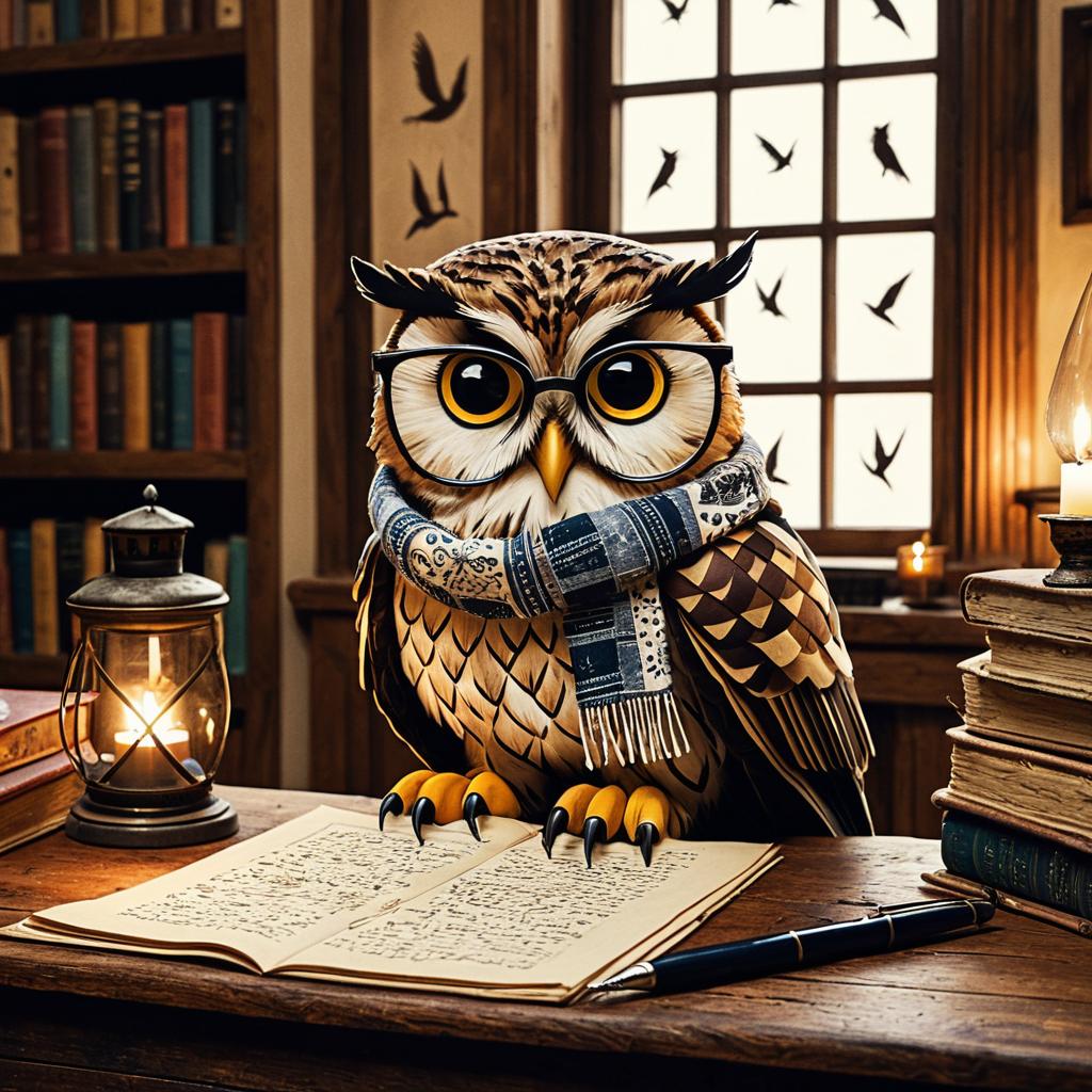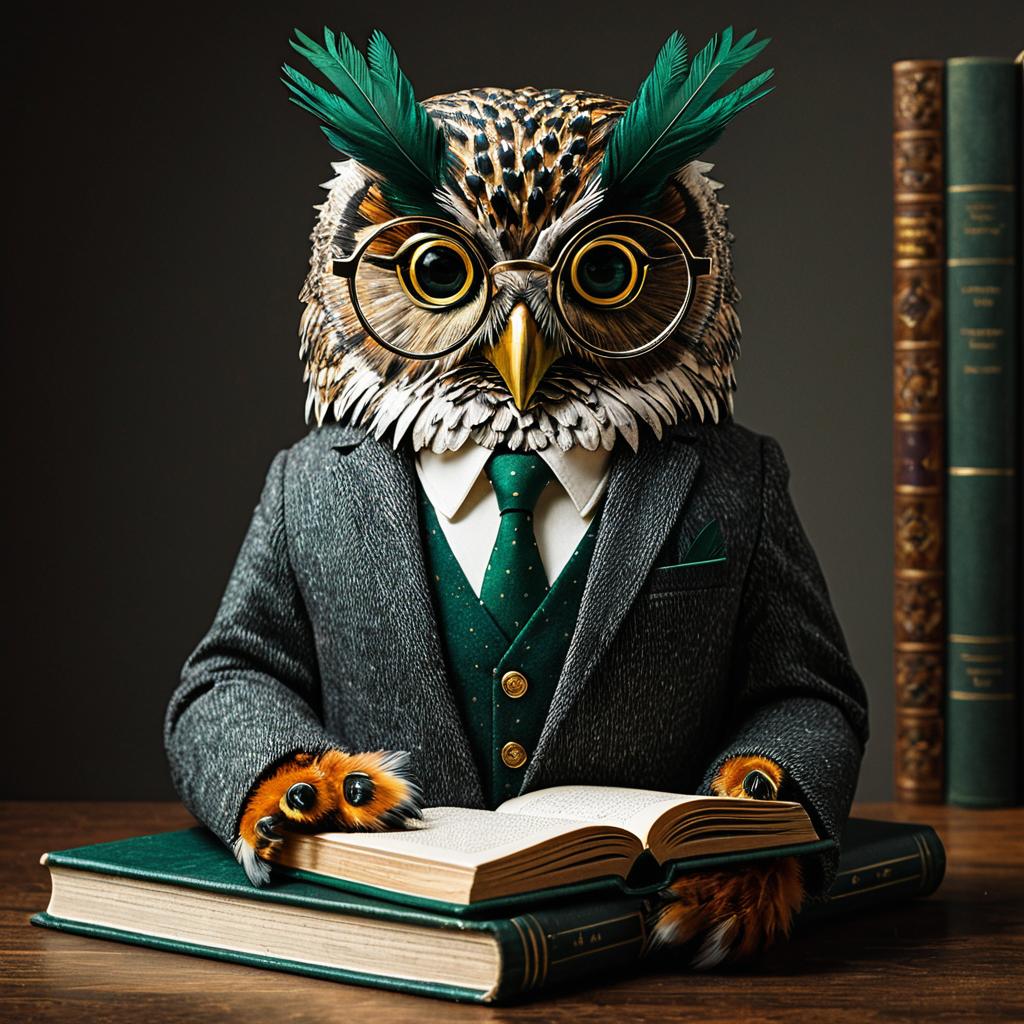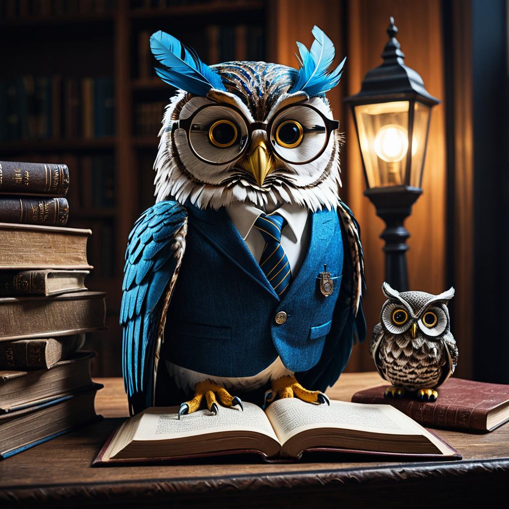 A 3D-rendered owl with vibrant blue feathers, wearing round glasses and a tailored suit, holding an open book. The owl has a wise, intellectual expression, with finely detailed feathers and realistic texture on the suit. The scene is illuminated with soft, ambient lighting to enhance the character's depth, showcasing intricate detailing on the glasses and the book’s cover. The overall style combines a blend of realism and charm, perfect for a distinguished, scholarly vibe.