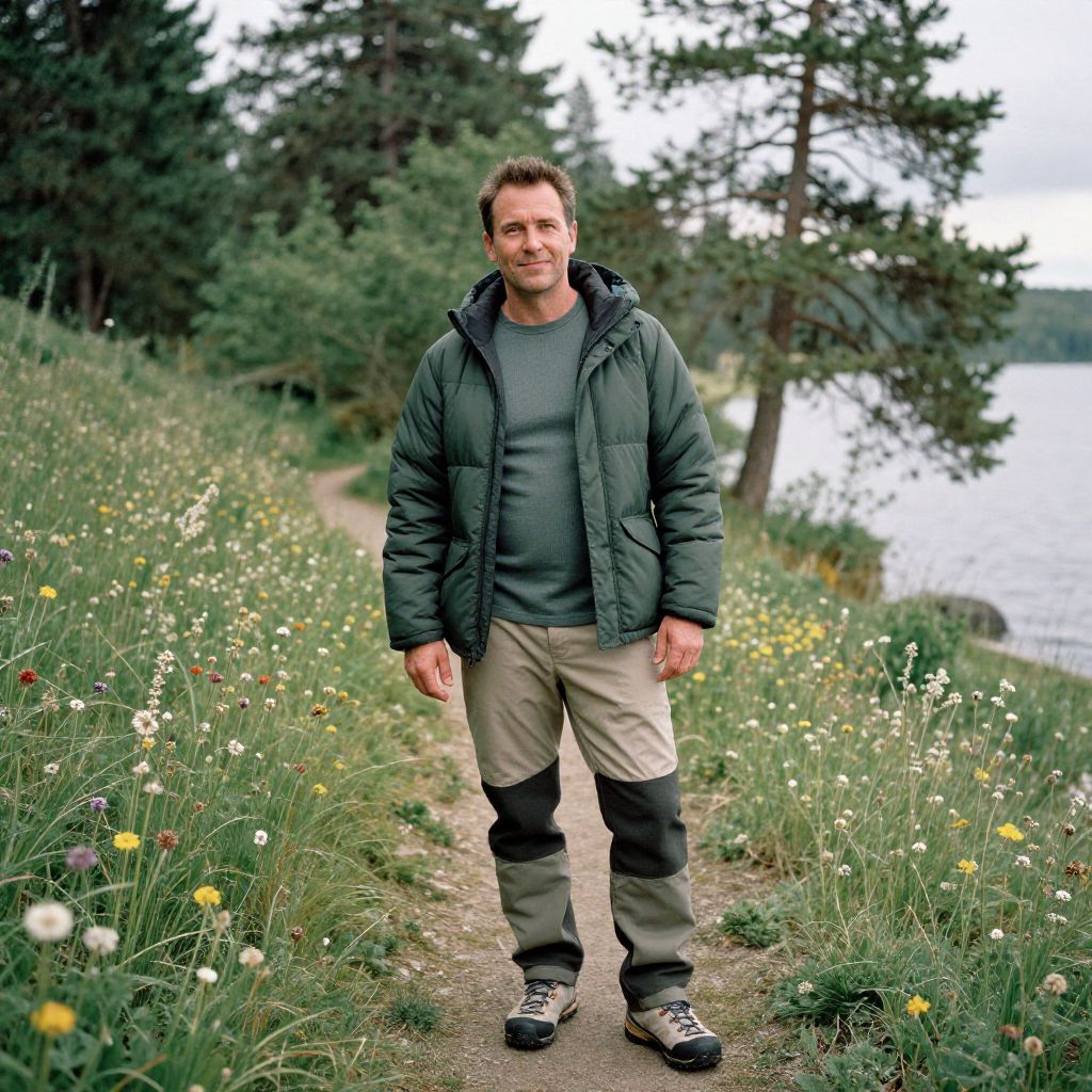 A man, heavy-duty down jacket, forest green, long-sleeve thermal shirt, beige hiking trousers, breathable gaiters, lightweight trail shoes, serene lakeside trail, wildflower meadows, whispering pine trees, eastman film stock, relaxed smile, enjoying nature. Man has masculine face and piercing eyes