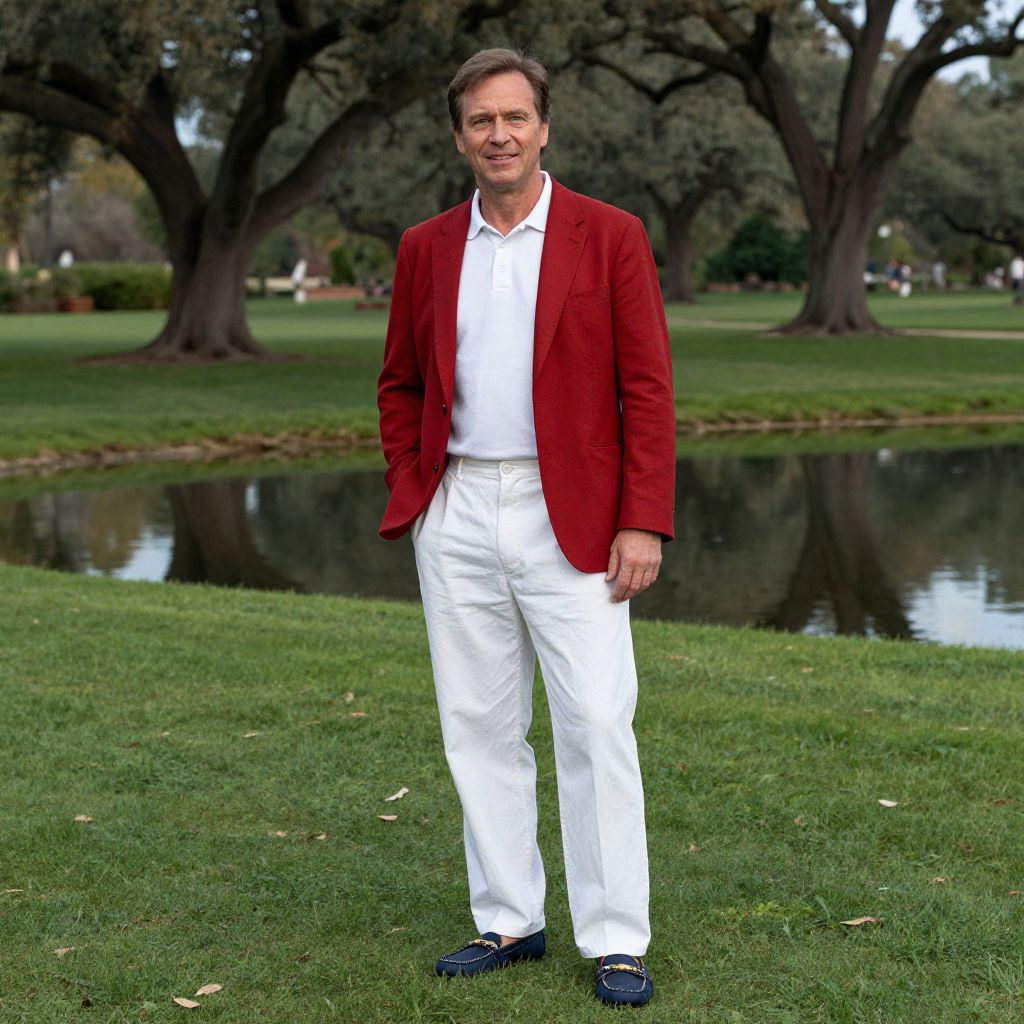 Photograph of a middle-aged man with short brown hair, wearing a red blazer, white shirt, white pants, and navy shoes, standing on