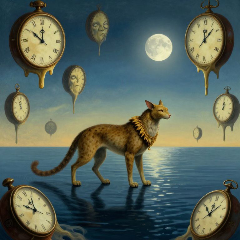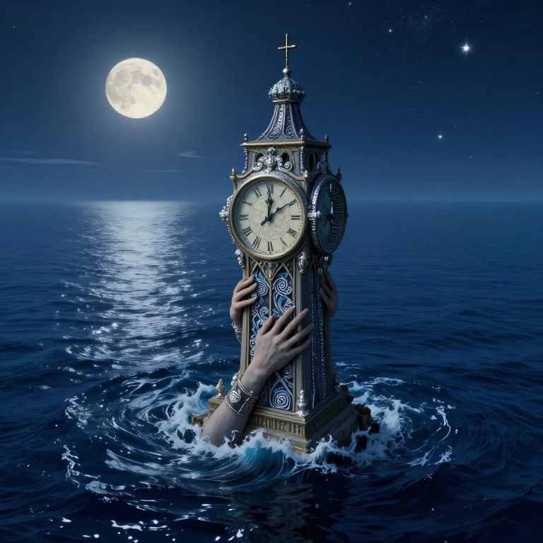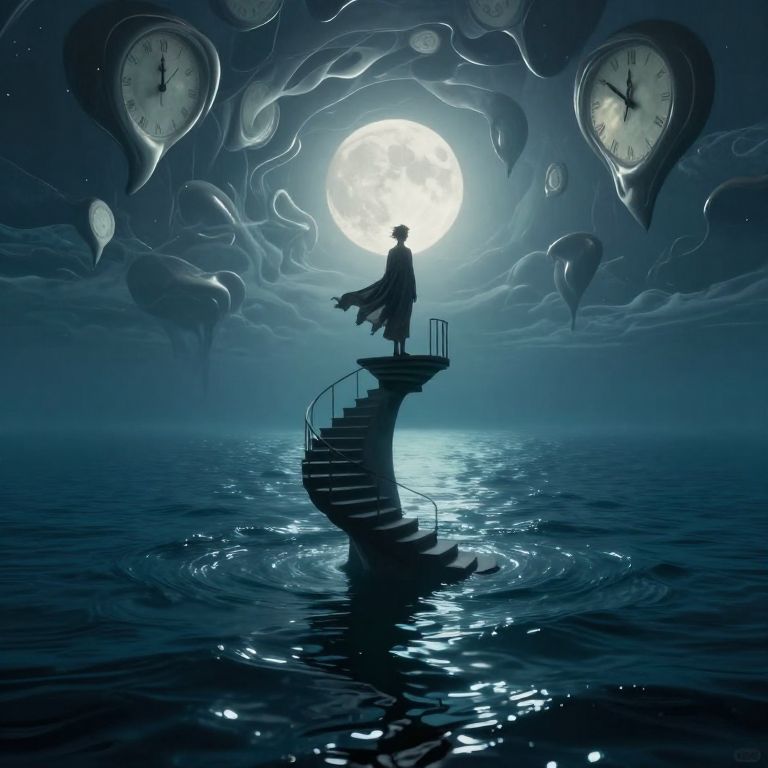 Envision an evocative digital painting showcasing the mystique of a tranquil nocturnal beach under the moon's soft illumination, crafted in a surreal style akin to Salvador Dali's melting timepieces. A solitary figure stands knee-deep in the water, their back turned towards the observer, clad in a Victorian suit intricately adorned with gears and cogs that sparkle under the lunar light. A tree nearby, its twisted branches extending over the sand, appears to have leaves fashioned from clocks, creating an enchanting, dreamlike ambiance. The distant horizon is painted in gentle shades of blue and purple, reflecting off the tranquil waves as if through an impressionistic lens. From an overhead viewpoint, this distinctive scene intertwines elements of fantasy, timelessness, and intrigue, encouraging viewers to explore the hidden depths concealed beneath its surface.