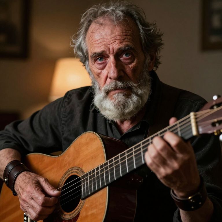 Craft a hyper-realistic portrait of an elderly musician with furrowed brows and serene blue eyes, his graying beard contrasting against dark leather wristbands adorning his arms. The intense gaze from his sorrowful yet determined eyes invites viewers into the soulful depths of the artist as he performs on an aged acoustic guitar. Lit by a warm glow emanating from behind, it casts shadows across his wrinkled face and highlights the calloused fingers gently plucking the strings, capturing a life devoted to music while hinting at a complex past and hopeful future.