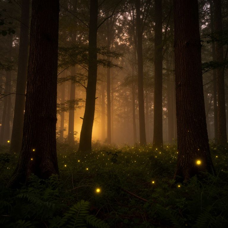 Photograph of a misty forest at dusk, with tall trees, glowing yellow fireflies, and a warm orange sunset light filtering through the fog in
