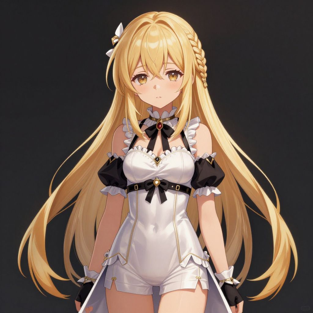 Digital anime-style illustration of a blonde, fair-skinned girl with long, flowing hair and golden eyes. She wears a white and black maid outfit with a black ribbon bow, off-shoulder sleeves, and a black belt. Her hair is adorned with a small white bow, and she has a small blush on her cheeks. The background is a solid dark gradient, highlighting her illuminated figure. The outfit features frilled edges and gold accents. The girl stands centered, looking forward with a calm expression. The art style is vibrant and detailed, emphasizing her hair and outfit.
