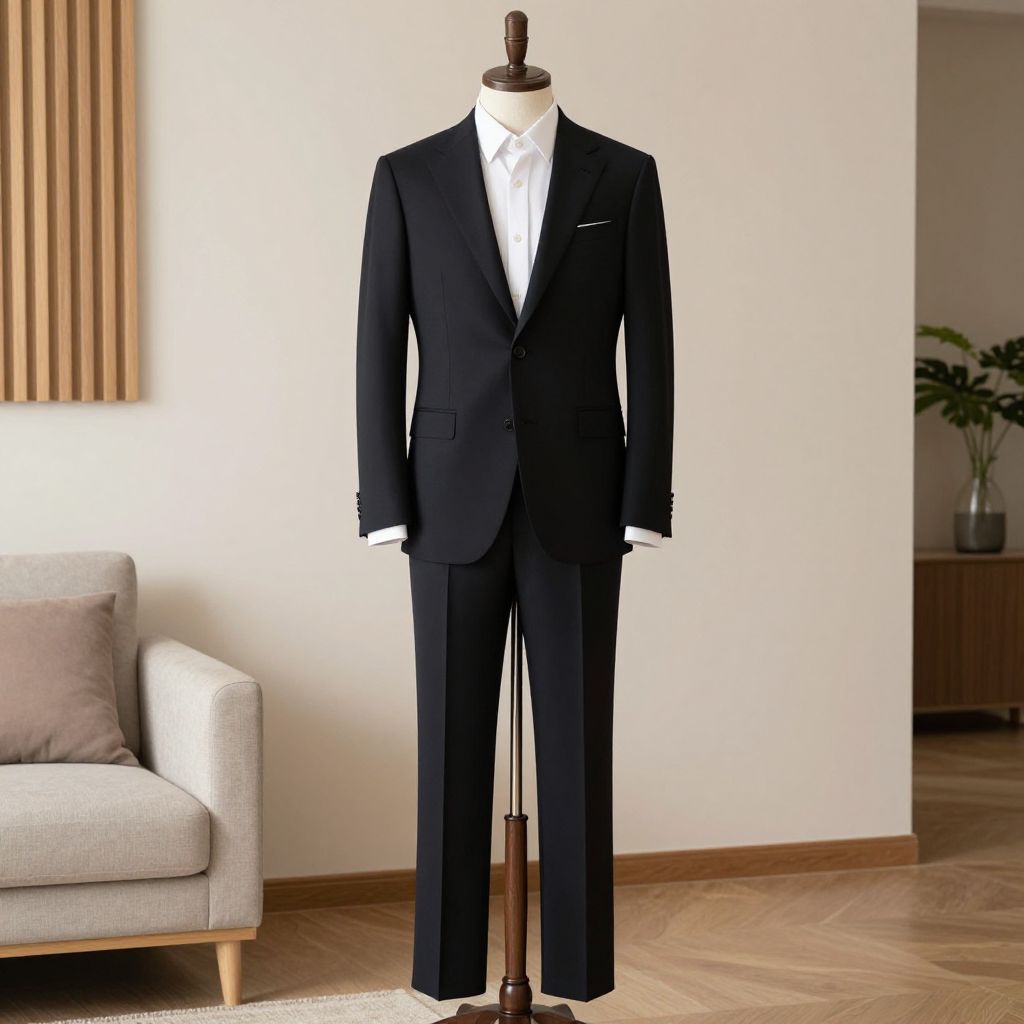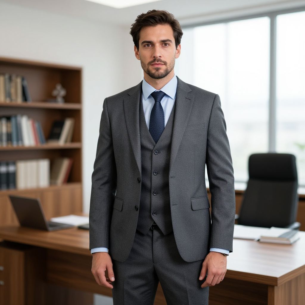Elegant prompt suit for men crafted from high-quality wool blend, with a classic three-piece structure, subtle tonal contrast, and refined stitching, displayed on a stylish man in a modern city lounge.