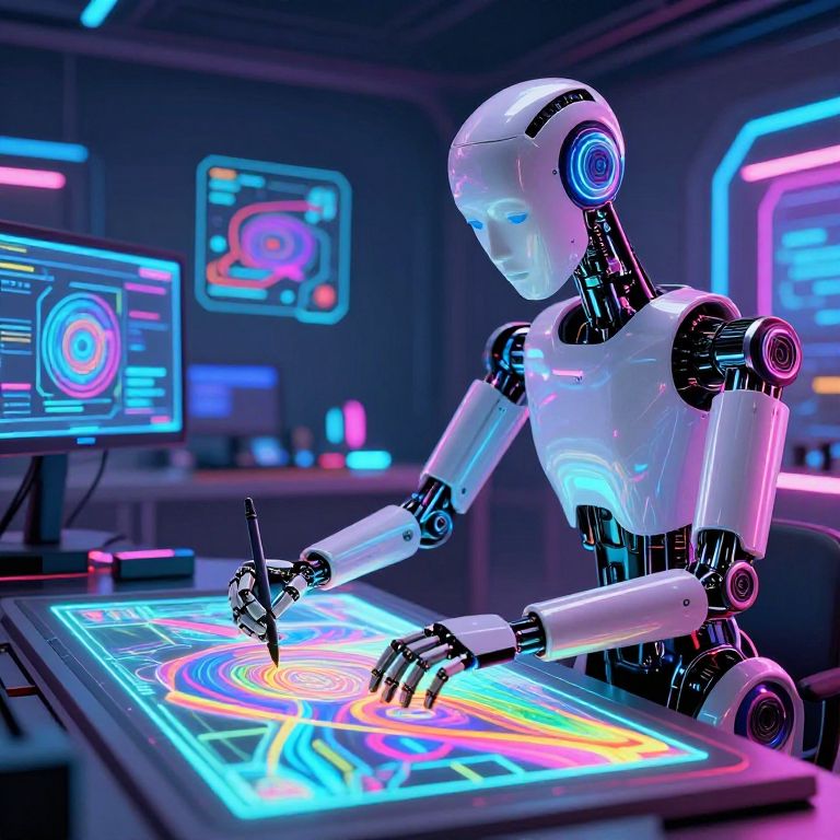 A Disney Pixar AI generator scene depicting a high-tech animation robot carefully crafting a joyful, expressive animated character in a bright, whimsical studio full of digital screens and glowing tools, capturing the magic of modern AI animation.