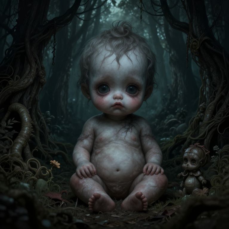 The ugliest baby in the world depicted in a dark fairy tale forest, twisted and warped features, oversized head, pale skin, melancholic expression, surreal and eerie vibe, horror and fantasy blend, intricate background details