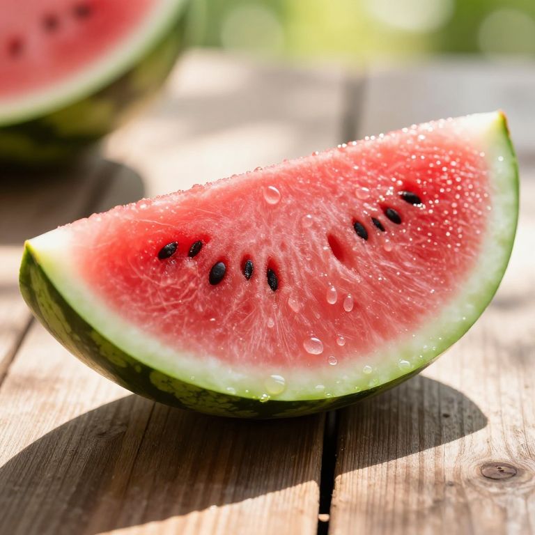Watermelon slice on a rustic wooden table bathed in golden sunlight, droplets of juice glistening, vibrant pink and green hues, summer picnic vibes, photorealistic style with soft natural shadows, refreshing and juicy atmosphere