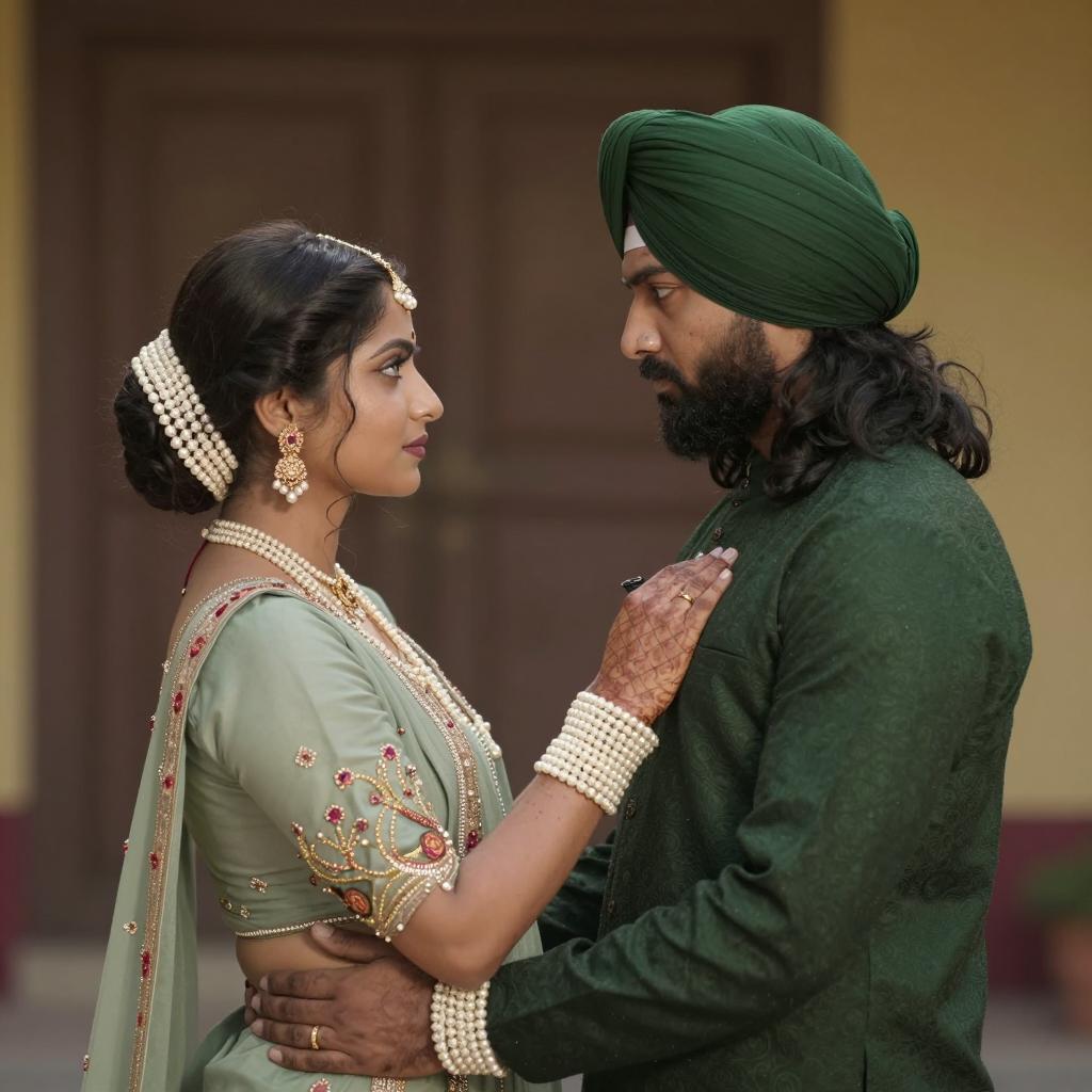 Couple in traditional attire. Woman with dark hair in an updo, pearl jewelry, and a pearl necklace, arms raised, looking at man. Man with long dark hair, green turban, serious expression, arms down, holding woman's wrists. Both wear pearl bracelets. Background with blurred brown and yellow tones. Intense eye contact between them.