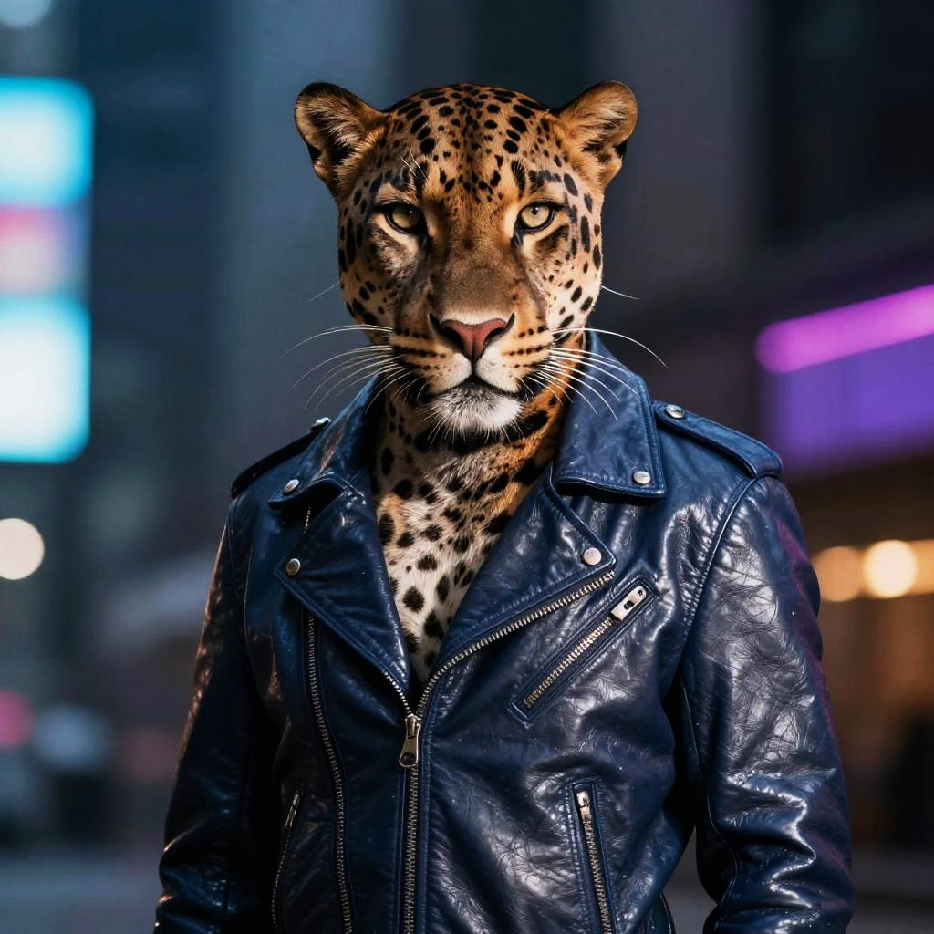 Elegant portrait of an panther in a leather jacket with colors midnight blue and silver against a urban neon background, showcasing its regal presence.