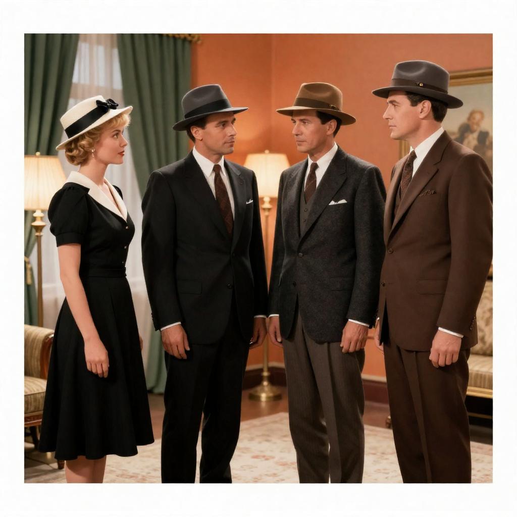 Movie poster with multiple scenes from "La Casa de Madam." Colorful upper right: six people in 1950s attire, standing and sitting. Lower left: black-and-white photograph of two men in suits. Lower right: man with microphone, woman in green dress. Upper left: close-up of woman with short blonde hair, smiling. Yellow box with black gramophone icon. Multiple facial expressions: smiling, neutral.