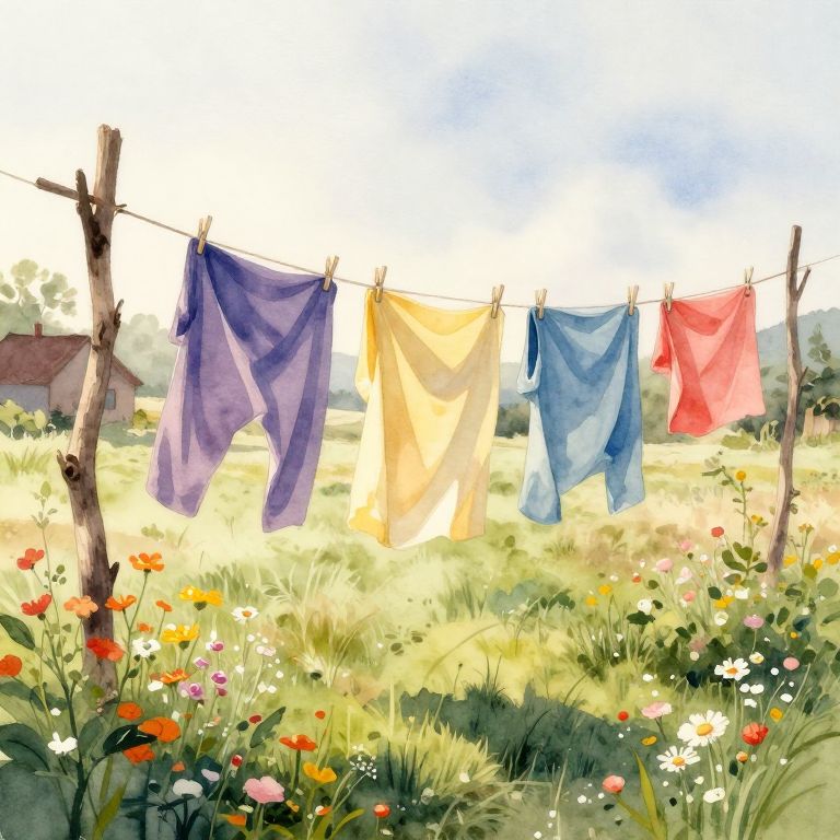 Watercolor-style painting of colorful laundry (purple, yellow, blue, red) hanging on a clothesline in a sunlit, flower-filled meadow