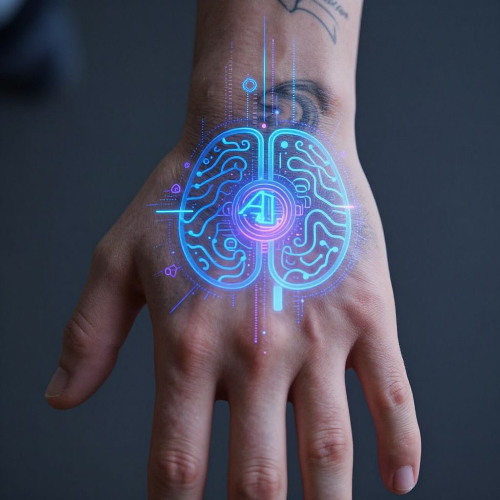 Close-up of a human hand with an AI tattoo displaying intricate artificial intelligence symbols and data streams, holographic effect with blue and purple hues, blending organic and digital elements in a surreal artistic style