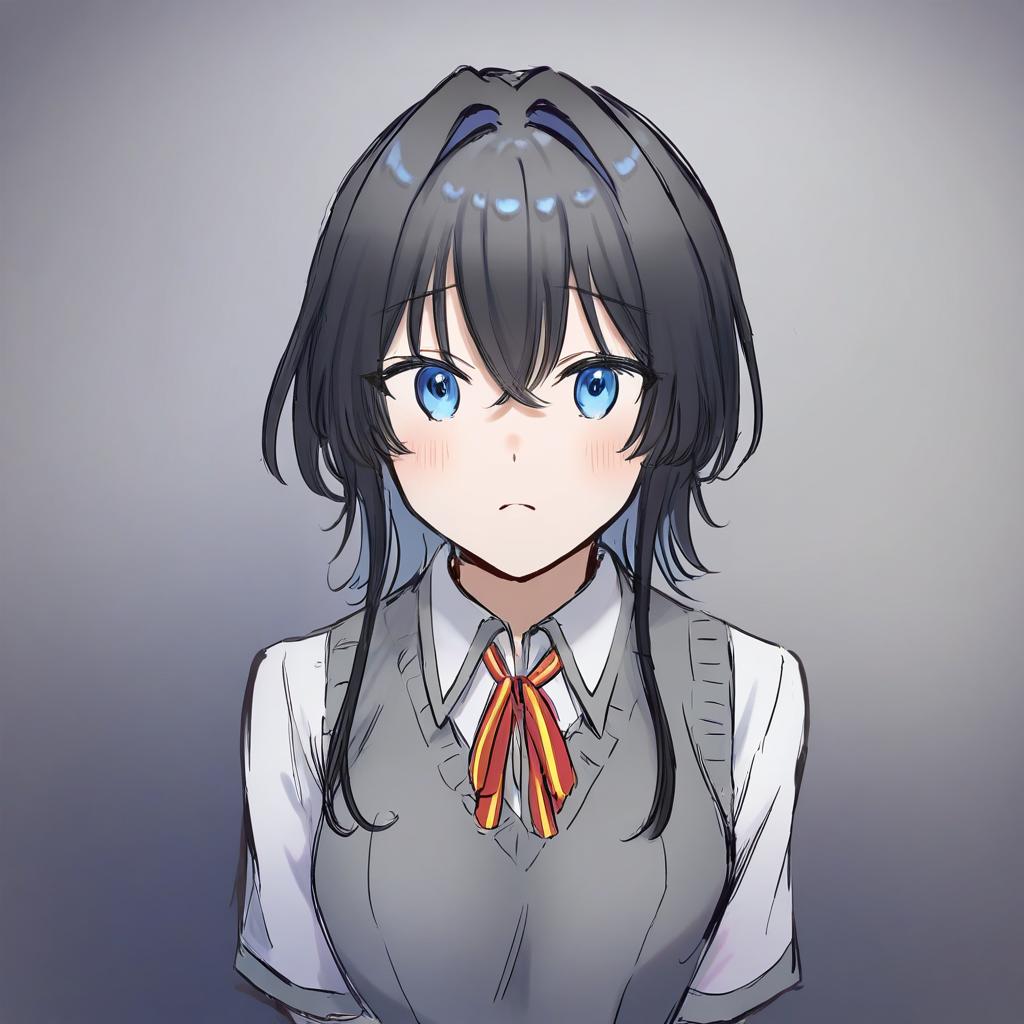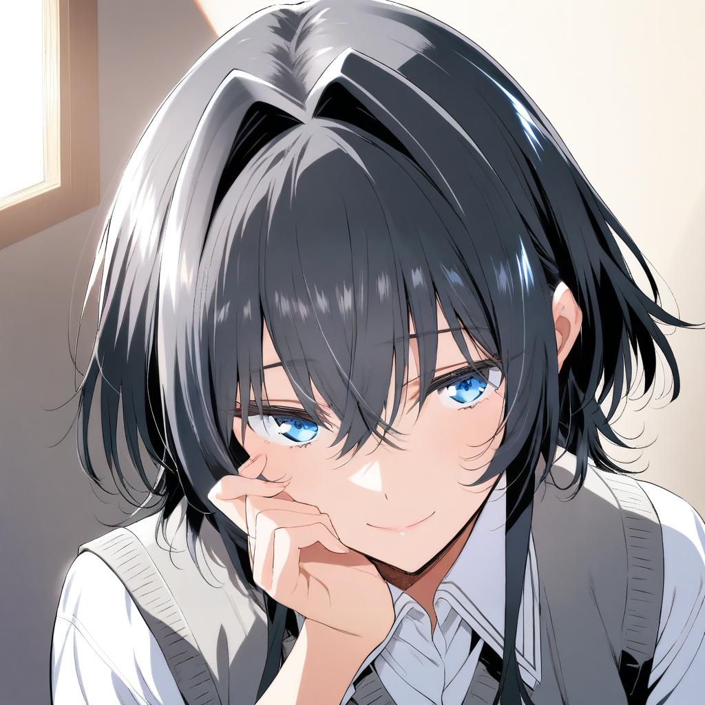 Asanagi yori, sasayaku you ni koi wo utau, 1girl, blue eyes, hair between eyes, black hair, long hair, short hair, sidelocks, hair intakes, crossed bangs, school uniform, white shirt, collared shirt, grey sweater vest, sweater vest, school uniform, by artist bomhat, leet