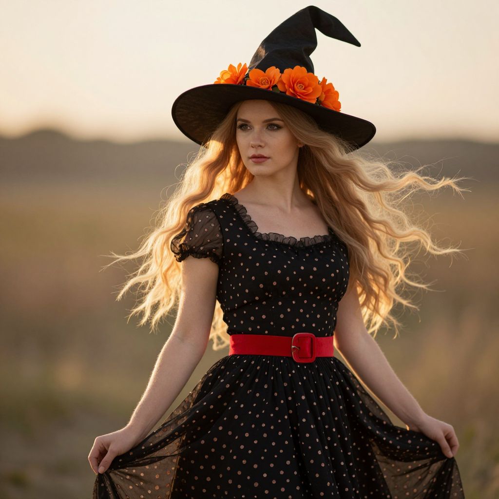 A woman with long, flowing blonde hair, wearing a elegant black dress adorned with delicate brown polka dots and a red belt that accentuates her waist. She wears a charming witch hat decorated with bright orange flowers, giving her a mystical and enchanting look. She stands confidently in a soft, golden-hour setting, with a gentle breeze blowing through her hair, adding a sense of magic and warmth to the scene.