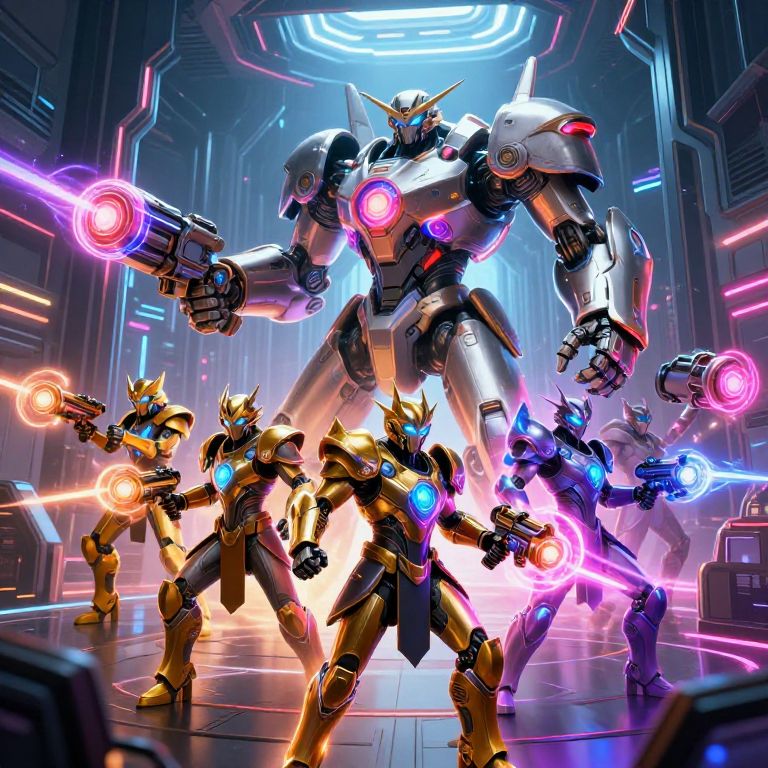 Warriors generator concept art, a futuristic machine creating diverse warriors with glowing armor and energy weapons, surrounded by a high-tech sci-fi laboratory, neon lights, dynamic composition, vivid colors, cinematic lighting
