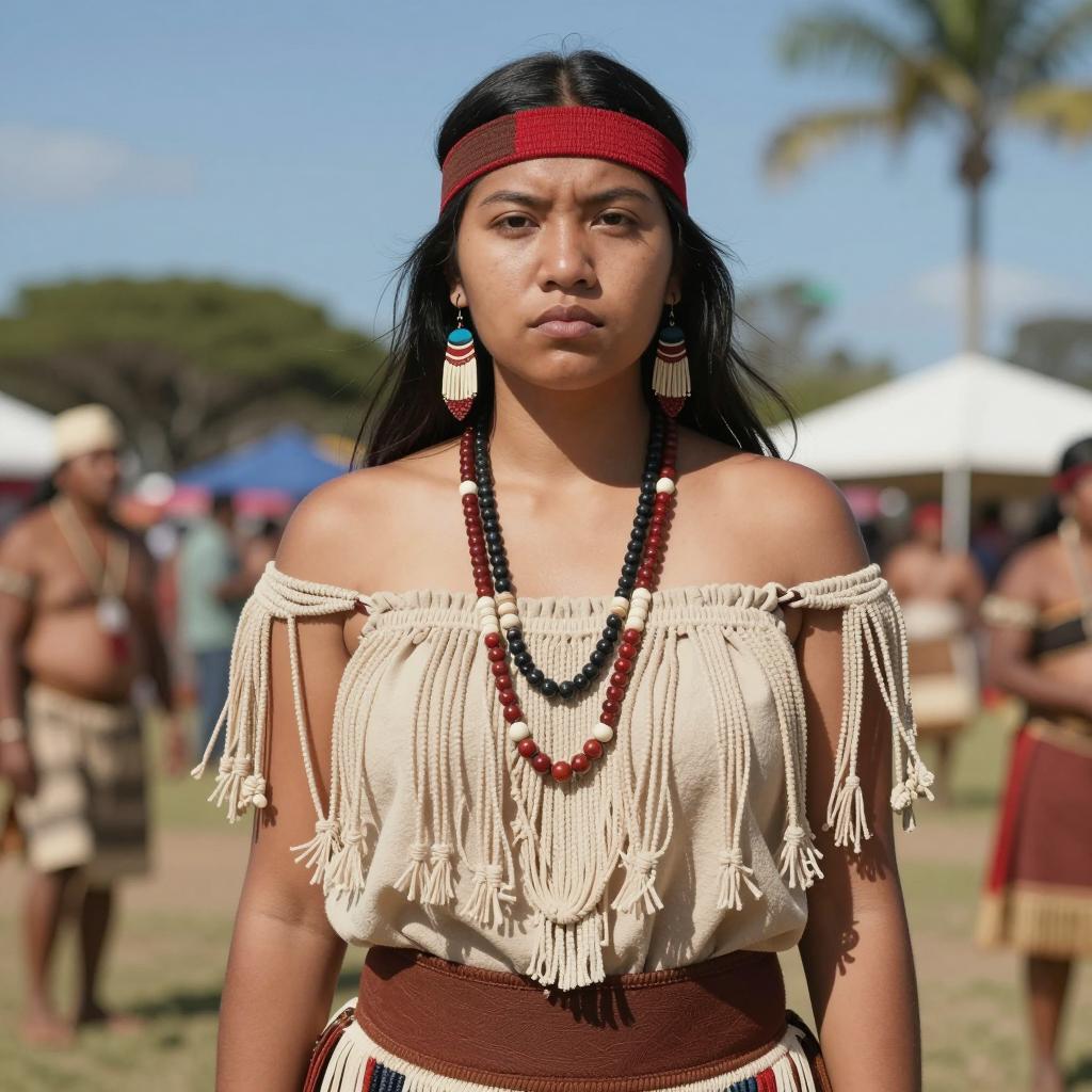 Costume maori, photorealistic, young woman, Native American tribe, front view, long black hair, red and brown headband, multiple bead necklaces, off-shoulder beige top with fringes, brown belt, tan skin, serious expression, outdoors, daytime, blurred background with people and palm trees, bright sunlight, natural light, detailed ures, traditional tribal clothing, realistic shadows, clear blue sky, cultural festival atmosphere