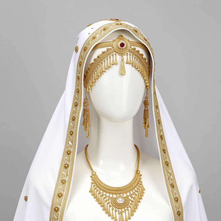 Mannequin wearing a white headdress with gold embroidery and accessories.