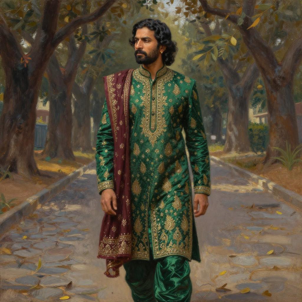 An artistic portrayal of a middle-aged South Asian man with shoulder-length braided hair and a neatly trimmed beard, contemplative expression dressed in a rich emerald-green sherwani with intricate gold paisley embroidery, silk churidar trousers and a maroon embroidered shawl draped over one shoulder, standing on a cobblestone street lined with ancient oak trees, rendered in a romantic realist oil painting with soft chiaroscuro, textured canvas and warm golden-hour lighting.