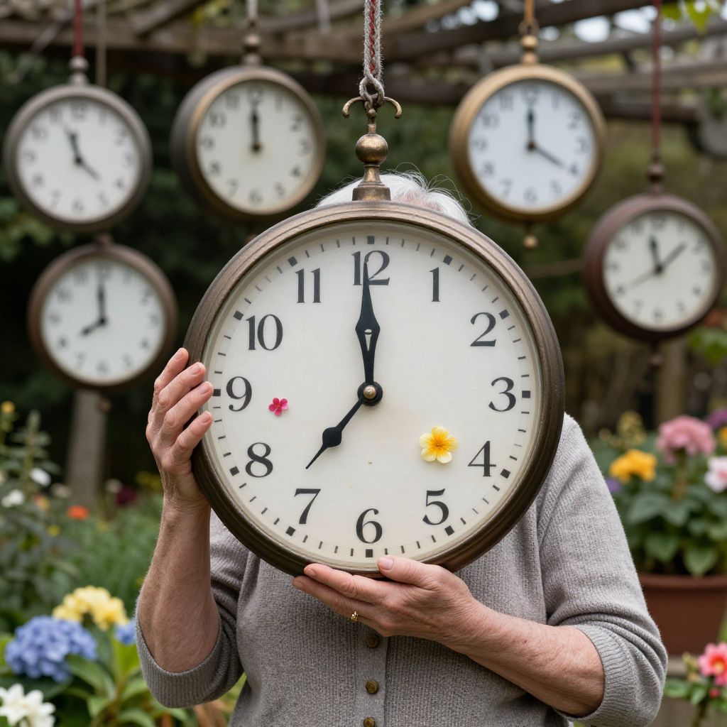 Photograph of an older woman with light skin, wearing a gray, knitted sweater, holding a large, round, antique-style clock face in front of her face. The clock has black numbers and hands, with a small red and yellow flower at the 3 o'clock position. The background features a garden with colorful flowers and multiple similar clocks hanging from a wooden pergola. The clocks have a rustic, vintage appearance, with white faces and black numbers. The image has a slight blur, giving it a dreamy, whimsical feel.