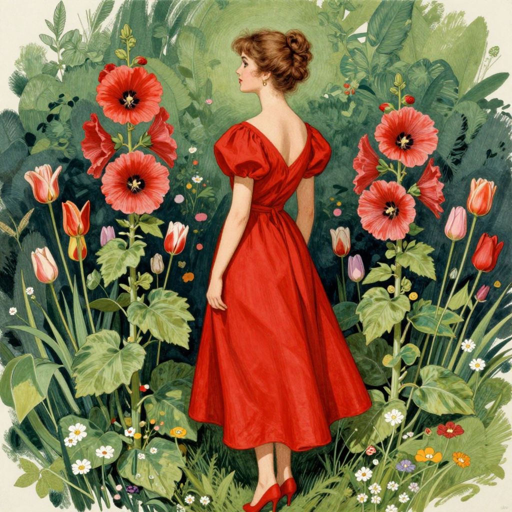 This digital illustration portrays a fair-skinned, brown-haired woman in a red, short-sleeved, V-neck dress standing amidst a vibrant garden. Her hair is styled in an elegant updo. She faces away, highlighting the dress's back and her red shoes. Surrounding her are tall red poppies, white and red tulips, and various green foliage, with small white and yellow flowers scattered among the plants. The background features a dense, lush greenery, creating a rich, natural setting. The illustration uses a bright, colorful palette and has a vintage, whimsical style reminiscent of mid-20th-century art.