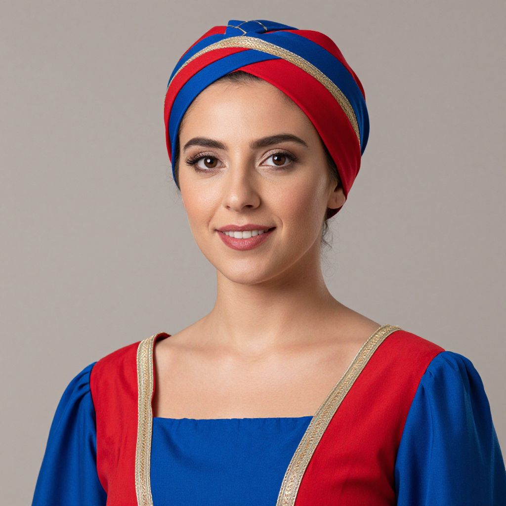Photograph of a young woman with fair skin and brown eyes, wearing a red and blue headscarf with gold trim, matching her red and blue dress with gold trim. She has a slight smile, light makeup, and natural eyebrows. The dress has puffed sleeves, and the background is a plain, light gray. Her hair is mostly covered by the headscarf, and she has a symmetrical, oval face with a gentle expression. The image is well-lit, highlighting her clear complexion and the vibrant colors of her attire.