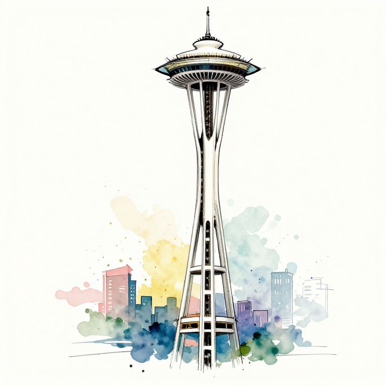 Space needle sketch with vibrant watercolor splashes, loose and expressive lines, minimalist cityscape, soft pastel palette, creative and modern style