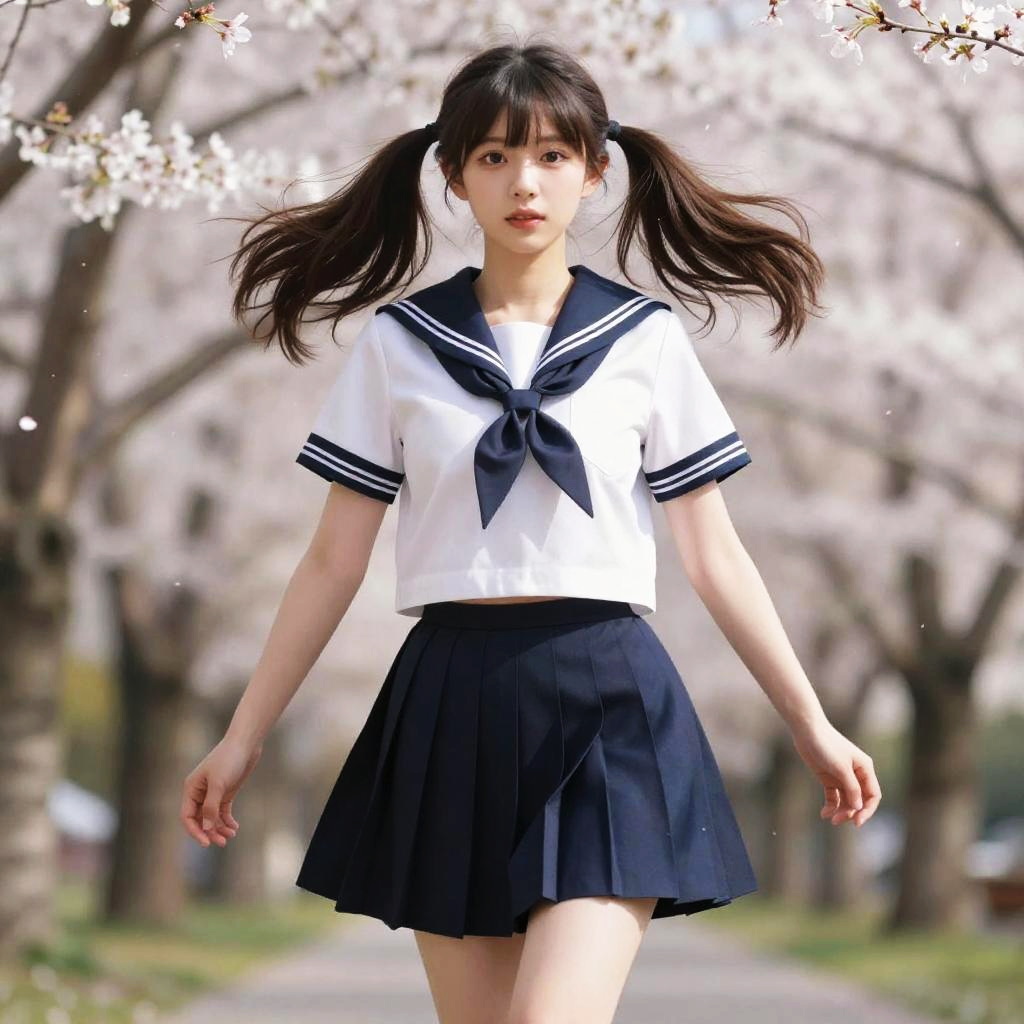 (RAW, best quality, masterpiece:1.5), (photo realistic, intricate details:1.2), ultra highres, absurdres, 1girl, beautiful face, detailed eyes, symmetric eyes, light on face, floating hair, short hair, twintails, (serafuku, student sailor uniform:1.2), pleated skirt, dark blue, medium breasts, shiny skin, real skin texture, windy, outdoors, cherry blossom, petals flying, sunshine, bokeh, film grain, natural lighting, best lighting, detailed background, detailed shadow, sharp focus, depth of field f/2