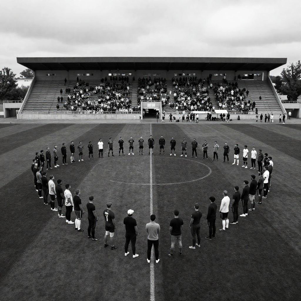 Black and white photograph of a large group of people on a football field, forming a V-shaped formation. Players in uniform stand in the center. Stadia seating and crowd in background. Overcast sky. Number of people: 70-80.