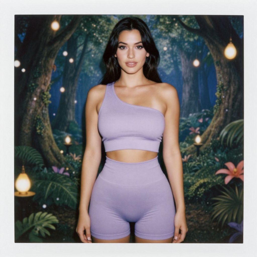 A woman, activewear, lavender two-piece workout set, one-shoulder sports bra, high-waisted cycling shorts, ribbed fabric, Wonderland forest path with floating lights, polaroid instant camera Sexy. Pretty face and beаutiful eyes. Big breasts