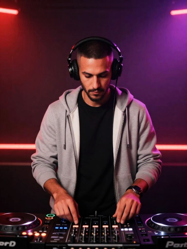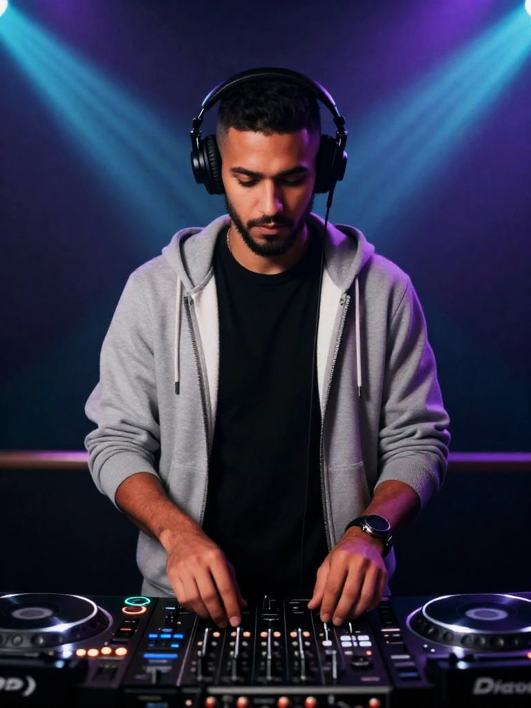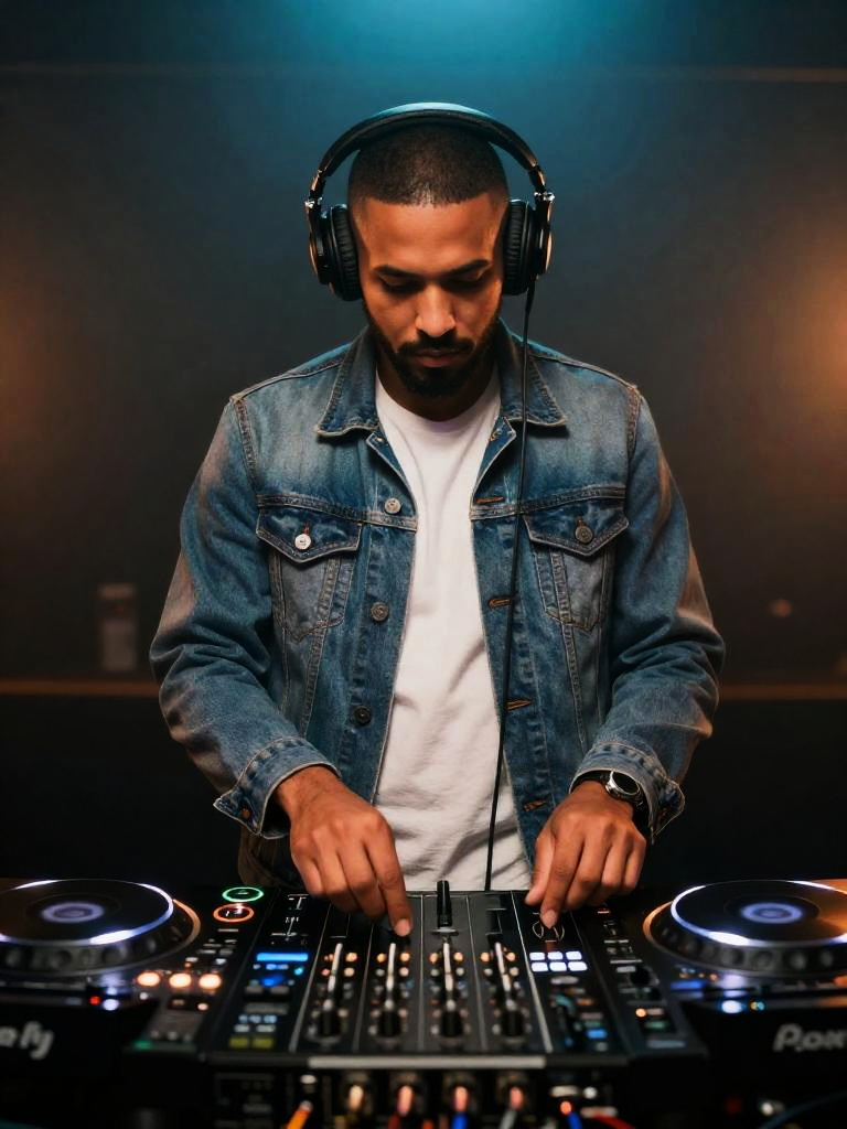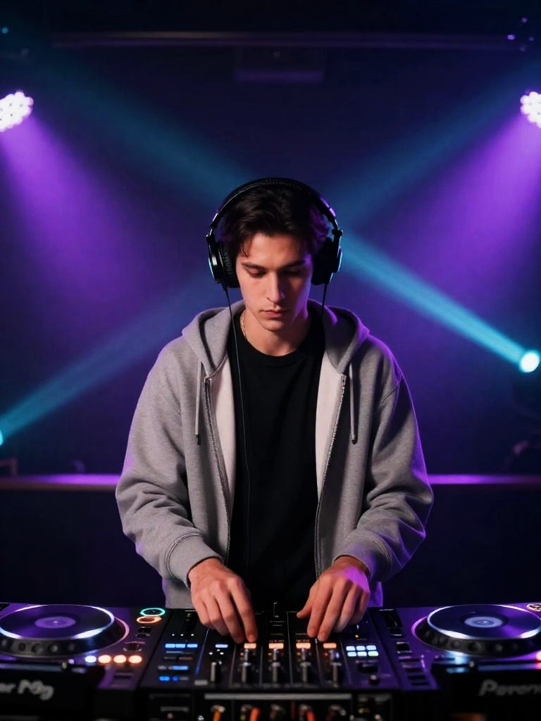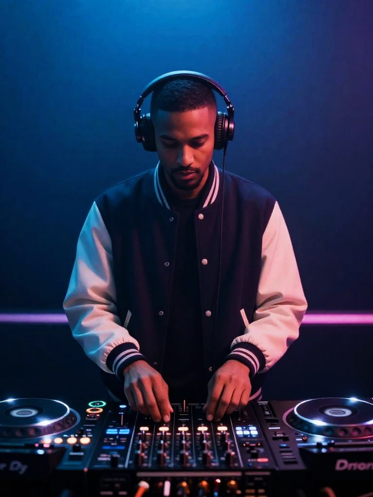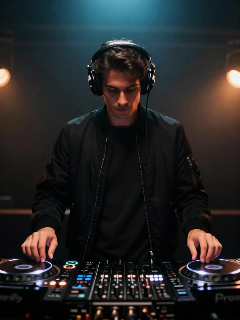 Male DJ in a club, light-skinned man with buzz cut and clean-shaven face wearing black bomber jacket and simple dark tee, standing centered behind two DJ decks with both hands on the turntables, head slightly bowed in concentration, heavy headphones over his ears, cinematic wide shot with hazy turquoise and amber stage lights reflecting off the equipment filling the scene, moody nightclub atmosphere, detailed realistic photography
