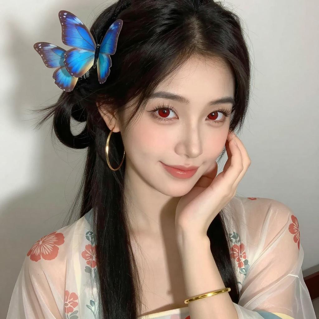 Photograph of an Asian woman with long black hair, wearing a blue butterfly hairpiece, large gold hoop earrings, and a gold bracelet. She has fair skin, red eyes, and a slight smile, with her hand gently touching her cheek. She wears a white, semi-transparent garment with a red floral pattern. Bright light illuminates her face.