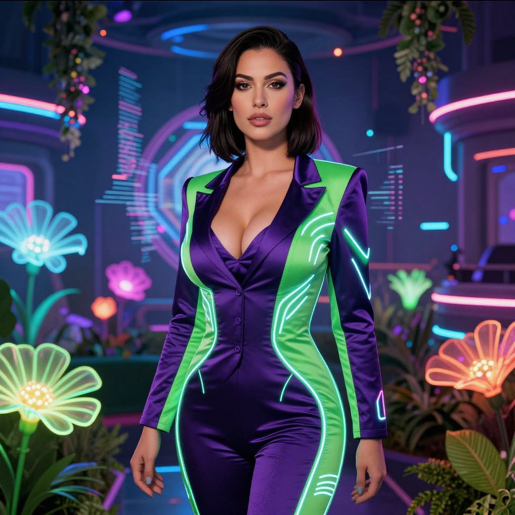 A confident woman with sharp cheekbones, high cheekbones, and a calm, intelligent gaze dons a futuristic neon party outfit — a deep violet and electric green suit with animated light patterns that pulse when she moves — standing in the middle of a floating neon-lit garden in a sci-fi nightclub, surrounded by holographic flowers and ambient soundwaves vibrating through the air.. The woman has big tits and cute face