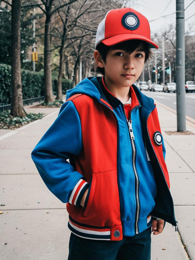 Pokemon Trainer Cosplay Boy, boy in a blue and red jacket and hat standing on a sidewalk