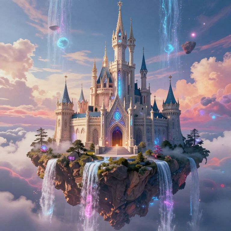 Enchanti castle on a floating island, surrounded by swirling colorful clouds, sparkling waterfalls cascading into the sky, intricate gothic architecture with luminous runes, dreamy magical aura, fantasy landscape with vivid colors and surreal elements.
