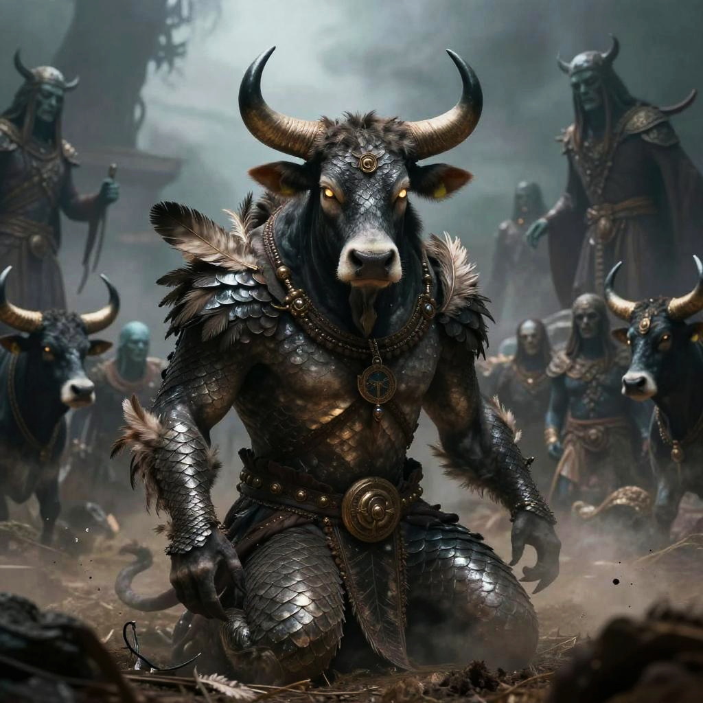 Veles – God of the underworld, cattle, and magic, portrayed as a spectral figure with eyes like burning coals, draped in ethereal veils of mist, set in the shadowy banks of an enchanted river flowing between the realm of the living and the dead.