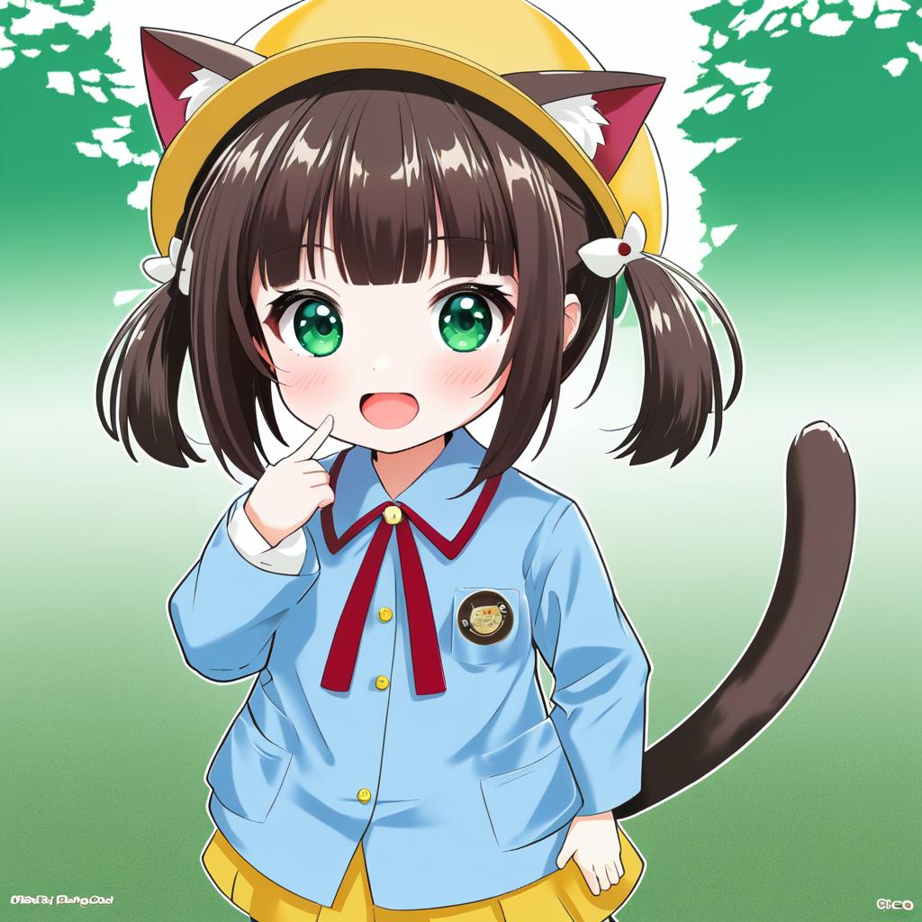 This is a digital anime-style drawing of a cute young girl with large green eyes, brown pigtails, and cat ears. She wears a yellow hat, light blue school uniform with a red ribbon, and a yellow skirt. Her black cat tail is visible behind her. She smiles with her right hand near her mouth. The background is a gradient from green to white with abstract white shapes. The artist's watermark, "CHIBI ANIMESHU," is in the bottom left corner. The girl's expression is cheerful and playful.