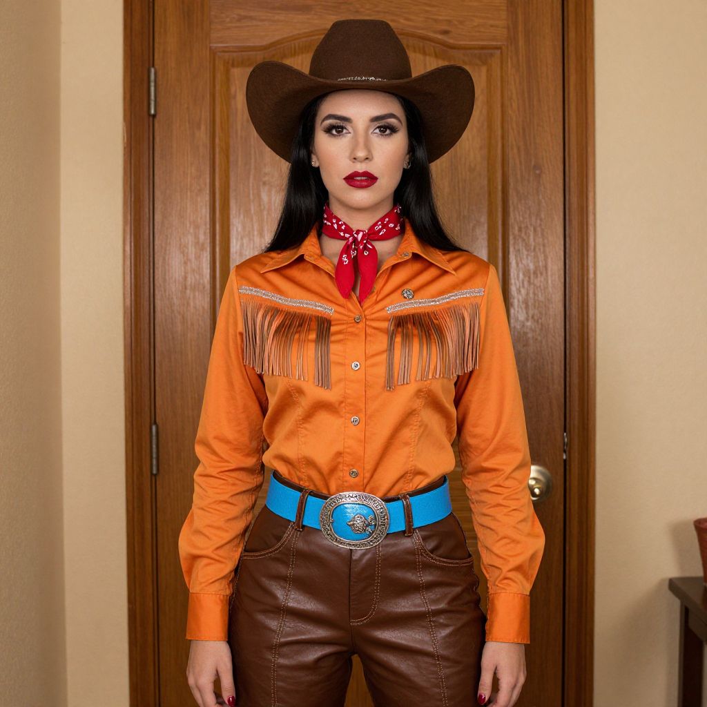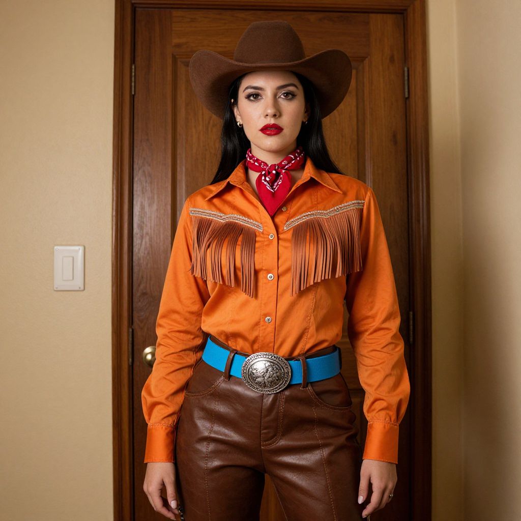 Photograph of a confident woman standing in front of a wooden door. She's wearing an orange cowboy shirt with fringe details, brown leather pants, a bright blue belt with a large silver buckle, and a brown cowboy hat. Her dark hair is long, and she's got bold red lipstick and a red bandana around her neck. She looks straight at the camera with a serious expression. The room has beige walls.