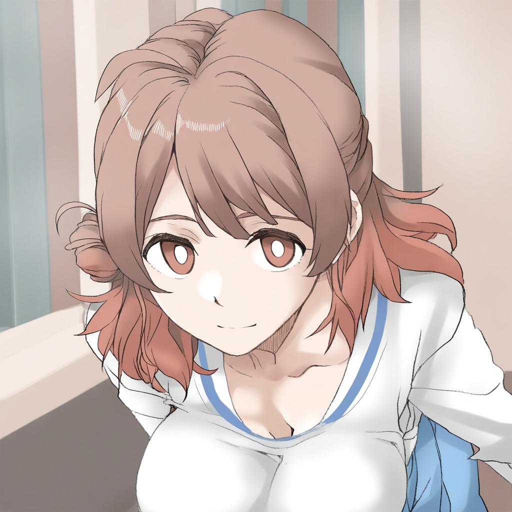 Hanami ume, gakuen idolmaster, 1girl, brown eyes, brown hair, gradient hair, medium hair, ahoge, single side bun, large breasts, school uniform, white shirt, by artist elf (stroll in the woods), leet
