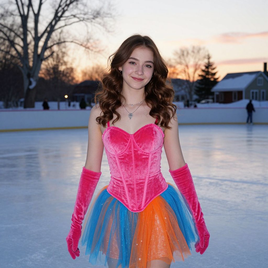 Photograph of a young woman with wavy brown hair standing on an outdoor ice rink at sunset. She's wearing a vibrant pink velvet corset with a sweetheart neckline, blue and orange tulle skirt, and matching pink elbow-length gloves. She has fair skin and a cute smile, with a necklace around her neck. The background shows a snowy landscape with bare trees and a house.