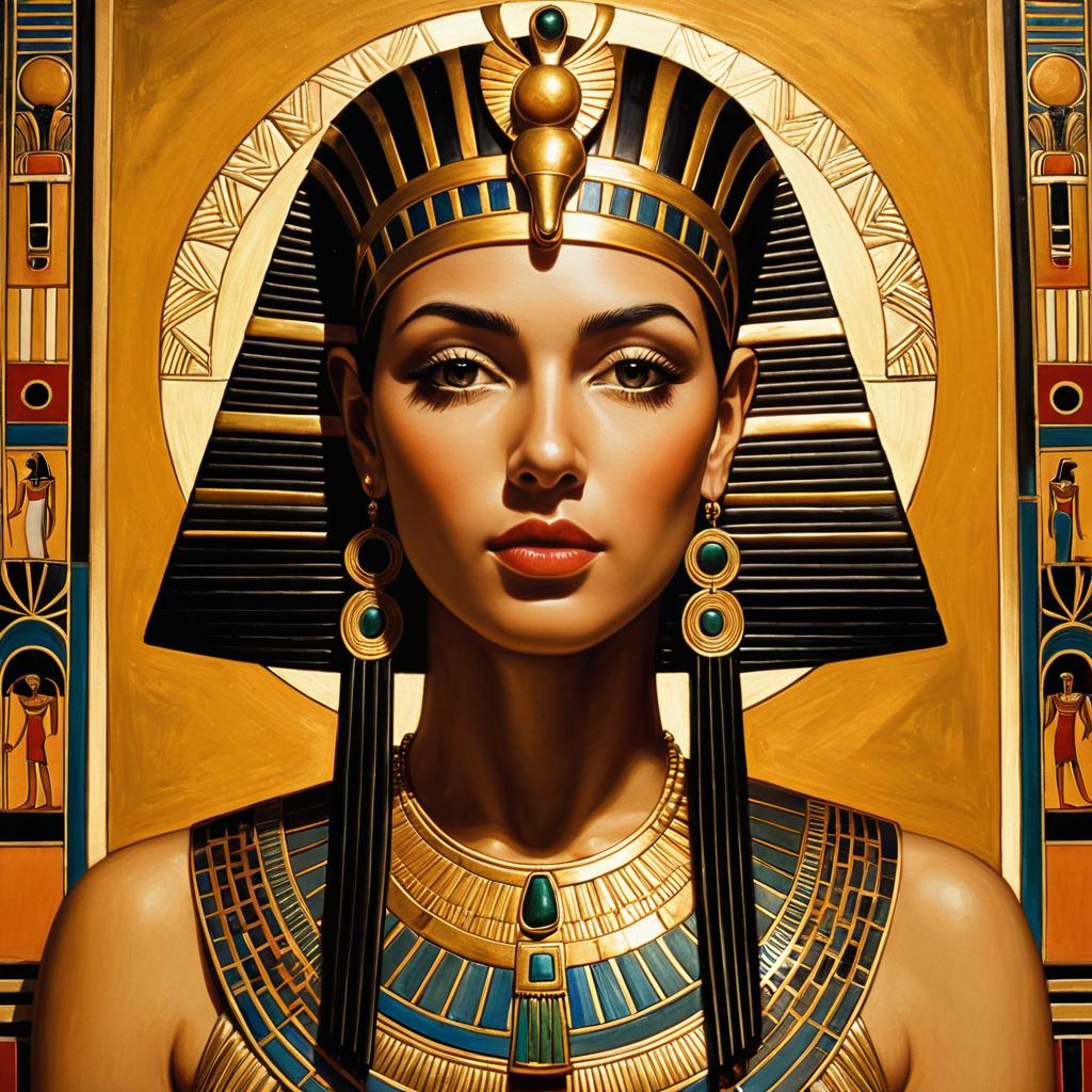 A ancient egyptian queen adorned with gold, art deco painting, warm sunset lighting, by tamara de lempicka, gustav klimt