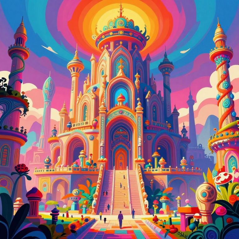 A vibrant, digital illustration of a colorful fantasy castle bathed in a bright, radiant sun at the top center. The ornate, multi-towered building features intricate arches, domes, and statues, with a grand staircase leading up to its central entrance. The foreground is adorned with lush, multicolored flowers and whimsical, twisted vines. Small, silhouetted figures are scattered around the base of the staircase. The sky is a vivid mix of blue, pink, and orange hues, with fluffy clouds and a few white birds flying in the background. The overall style is reminiscent of animated fantasy films, with bold, bright colors and exaggerated, playful details.