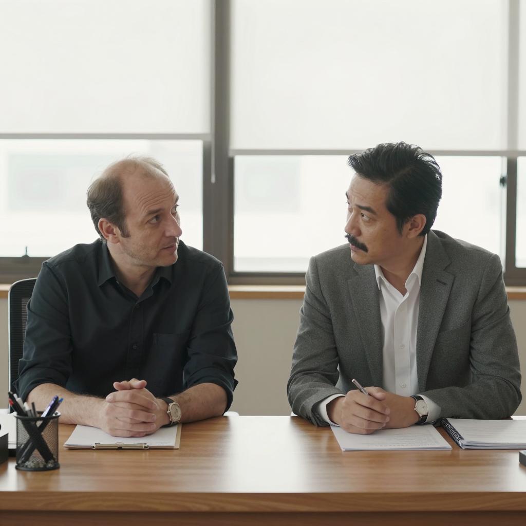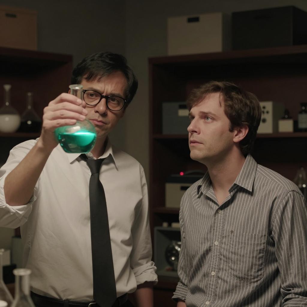 Photograph of two men in a dimly lit, cluttered room. The man on the left, with dark hair and glasses, wears a white shirt and black tie, holding a green glowing flask. The man on the right, with brown hair, wears a striped shirt, looking up at the flask. Background includes dark shelves and equipment. Both men have focused expressions.