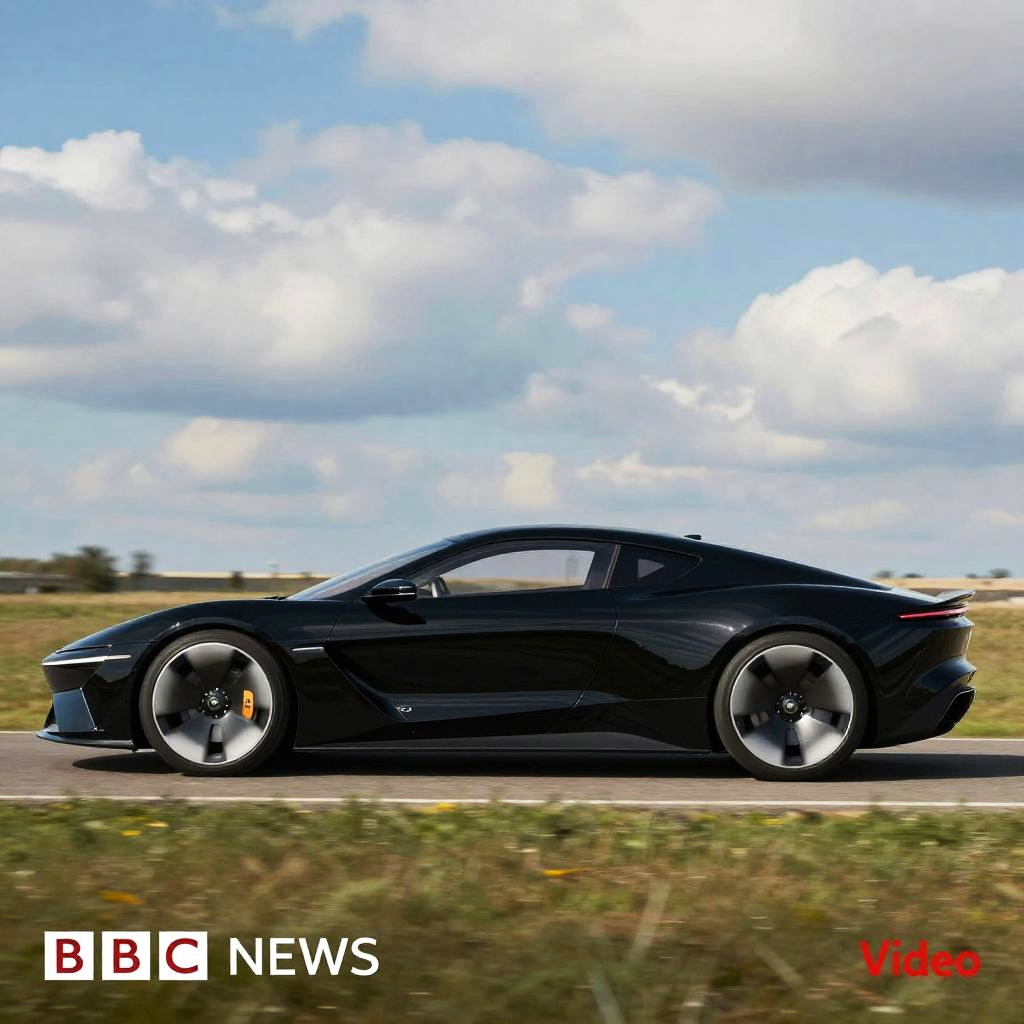 A photograph of a sleek, black, futuristic car with a smooth, aerodynamic design and a curved roof, driving on a grassy field with a cloudy blue sky in the background. The car's side profile is visible, showcasing its modern, minimalist lines. The bottom left corner has a red BBC News logo with Arabic text, and the bottom right corner has a red Video label.
