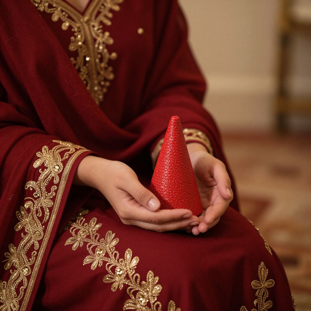 Woman draped in a rich red ensemble, featuring intricate gold embroidery, tenderly cradles a small, textured red cone-shaped object in her hands, set against a warm, softly lit interior backdrop.
