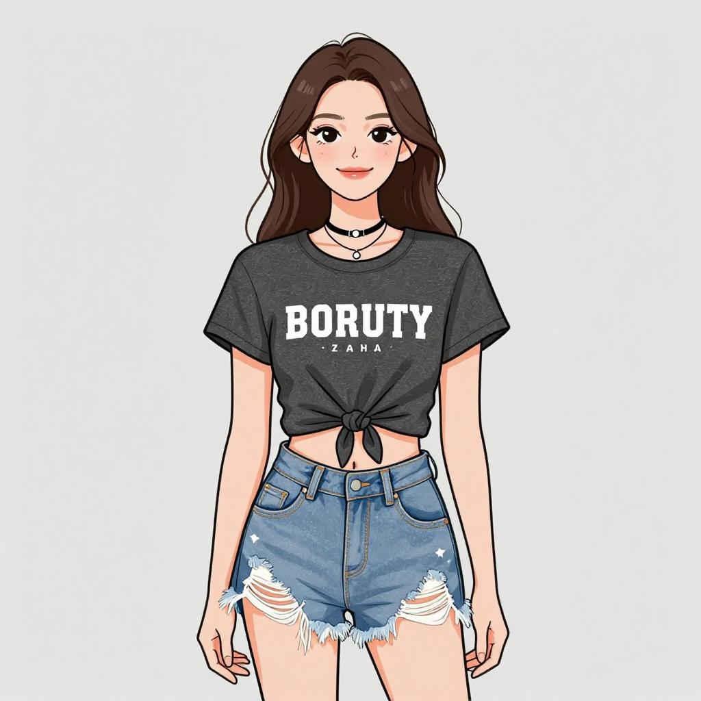 Digital illustration of a young woman with long brown hair, wearing a black "BORTY ZANA" t-shirt and distressed blue denim shorts, standing