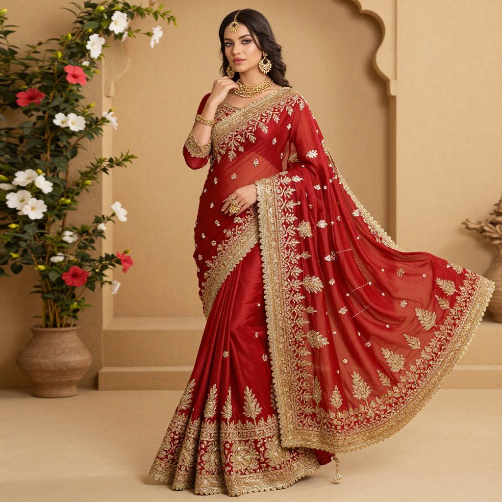 Pakistani dress prompt: A vibrant and handcrafted Pakistani saree in rich crimson and gold silk, flowing gracefully in a traditional wedding setting with blooming hibiscus flowers in the background, soft golden light, detailed embroidery, cultural elegance, realistic style.